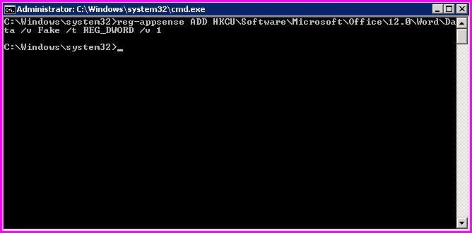 From within your command window, you can now manipulate the Personalization data directly using the commands you choose (note in this example, we are using a copy of reg.exe, reg-appsense.exe, to avoid the blacklist)