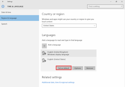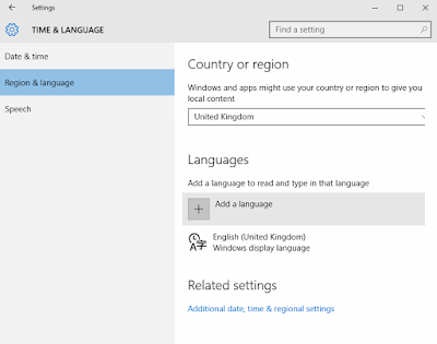 Off I went then into Windows 10's schizophrenic settings, going to Start | Settings | Time & language | Region and Language. Why everything just isn't in Control Panel I may never know.